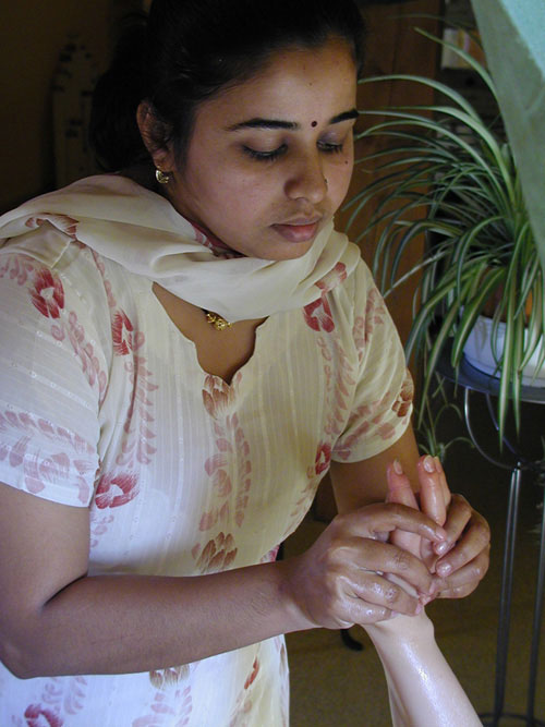 Die Ayurveda Fussmassage (Padabhyanga) und die Ayurveda Handmassage (Haatabhyanga) sind ein Genuss für Hand und Fuß. Diese Ayurveda-Bbehandlungen mit warmen Öl sind äußerst wohltuende und entspannende Massagen an den Gliedmaßen, die sehr selten in den Verwöhngenuss kommen. Viele Reflexzonen für die lebenswichtigen Organe befinden sich an der Fußsohle bzw. in der Handfläche und werden durch die intensiven Berührung vitalisiert. Diese beiden Ayurvedamassagen sind auch sehr gut gegen Arthrose und Gelenkrheuma.